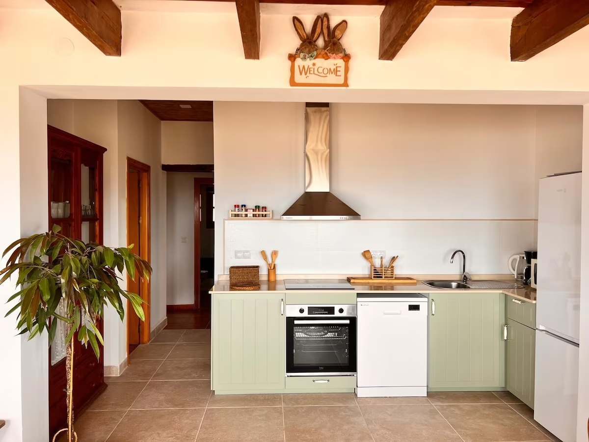 El interior de la casa se distribuye en una sola planta, lo que la hace accesible y cómoda. Cuenta con cuatro dormitorios: dos con cama de matrimonio y dos con dos camas individuales cada uno, todos decorados con un estilo acogedor y elegante. La casa dispone de dos baños completos con ducha y un aseo exterior adicional para mayor comodidad. La sala de estar es luminosa y espaciosa, con grandes ventanales que permiten disfrutar de las vistas panorámicas. El comedor, adyacente a la sala de estar, ofrece un ambiente cálido y está equipado con una mesa grande de madera. La cocina, totalmente equipada, cuenta con todos los electrodomésticos modernos necesarios para preparar deliciosas comidas.