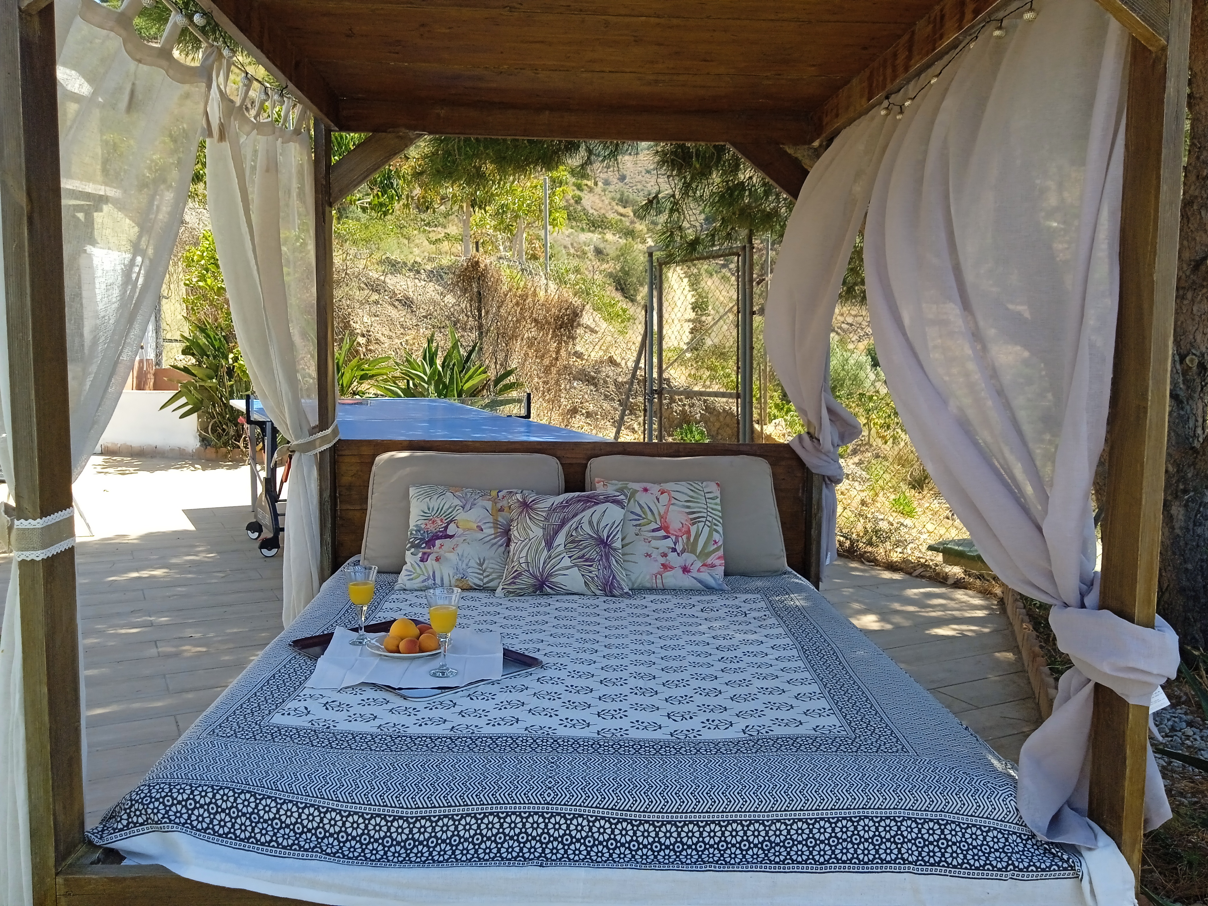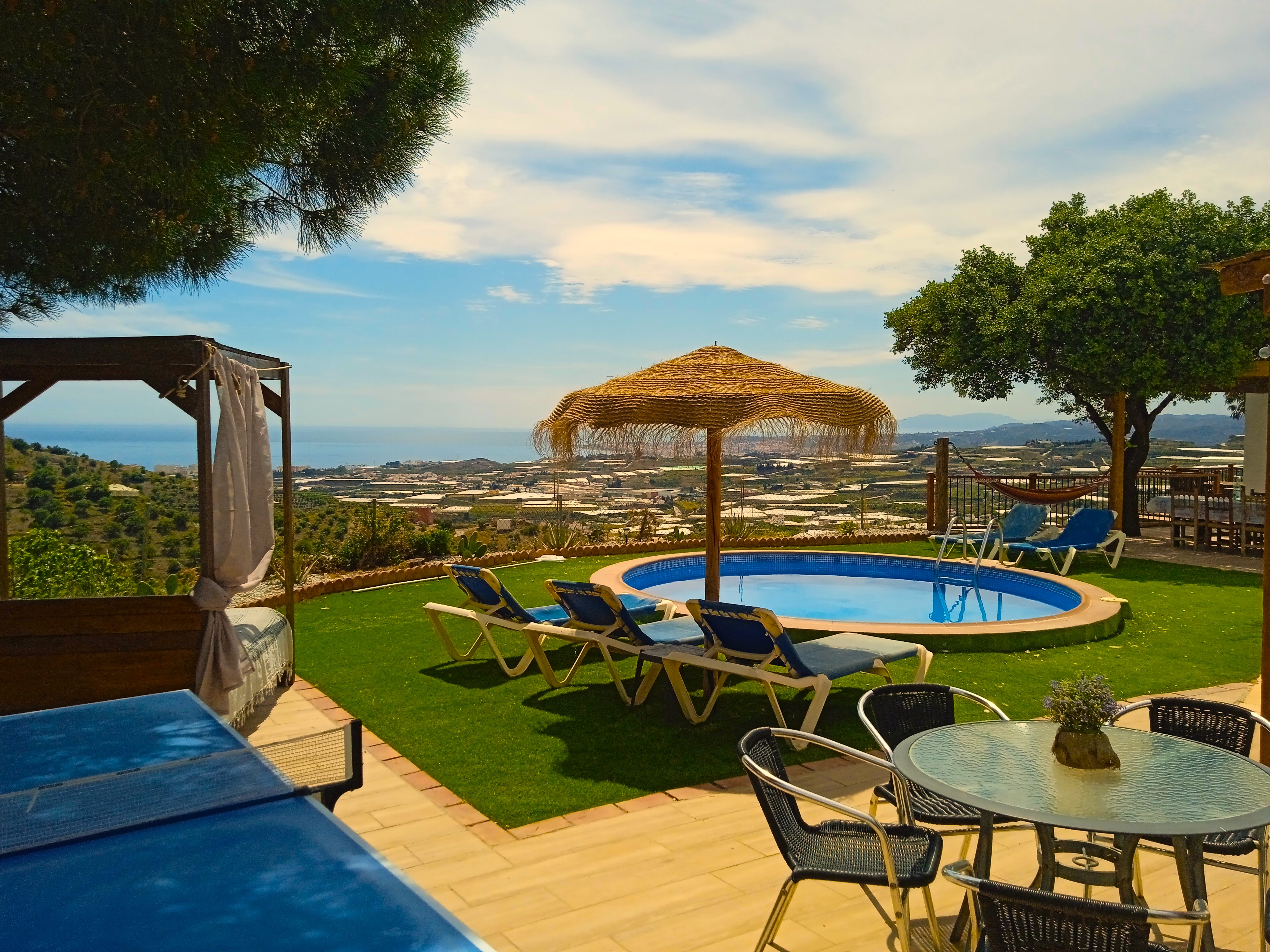 El exterior de la casa es simplemente espectacular. El porche cubierto es perfecto para comer al aire libre y disfrutar de las vistas al mar. El jardín bien cuidado incluye una piscina privada, ideal para refrescarse mientras se disfruta del sol andaluz. Además, hay una cama balinesa y una zona de hamacas para relajarse a la sombra de los árboles. La casa también cuenta con una barbacoa de carbón, perfecta para cenas al aire libre con familiares y amigos.