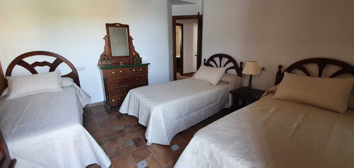 La casa presenta tres amplios dormitorios, uno con tres camas individuales, otro con una cama de matrimonio y un tercer dormitorio con dos camas individuales y dos camas de matrimonio, una de las cuales está en un altillo.