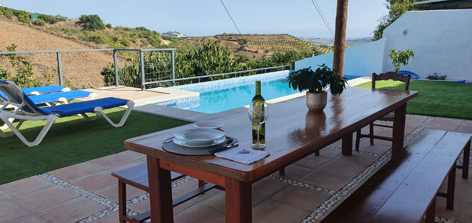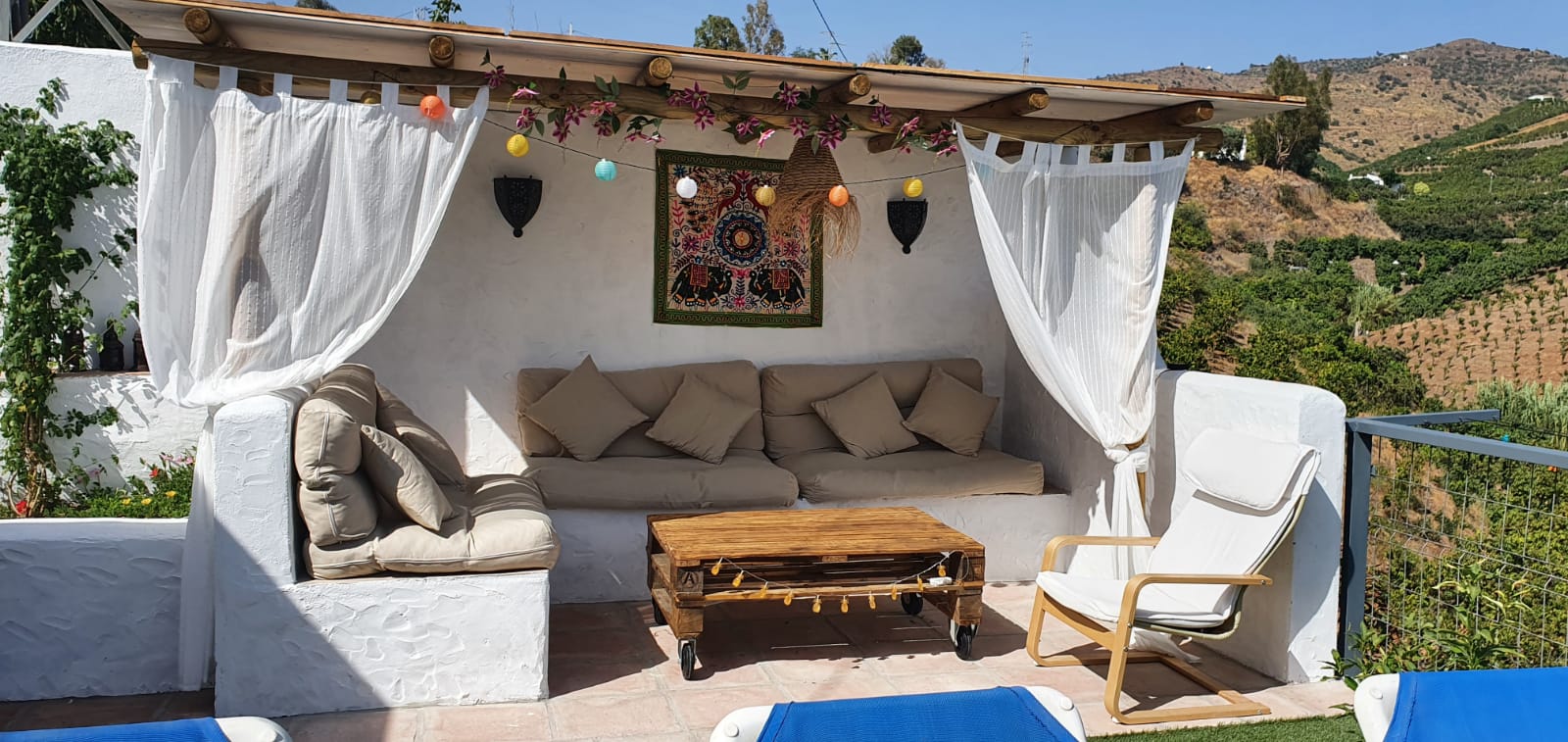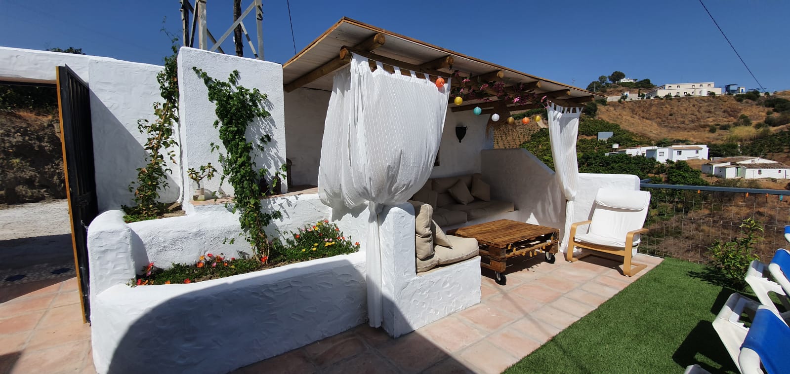Además de la piscina privada, los exteriores de la casa también presentan una zona chill out y una estupenda terraza con vistas junto a la barbacoa.